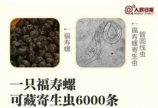 据统计,一只福寿螺体内的寄生虫少的有3000条,多的可达6000条,其中最主要的是广州管圆线虫。这种寄生虫一旦进入人体,会侵犯中枢神经系统,破坏神经组织,引发剧烈头痛、颈部僵硬、发热、呕吐等症状,严重时可导致痴呆,甚至死亡。
