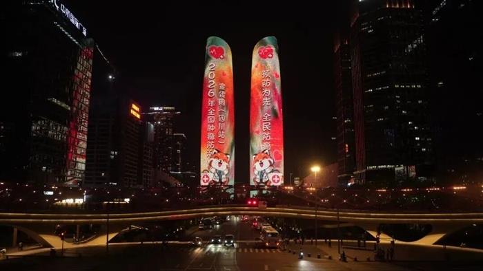 启动仪式后,4月13日晚,成都金融城天府双子塔为肿瘤防治宣传周点亮,“早防早筛早治 同心携手抗癌”主题光影照亮城市夜空,全省各市(州)也同步点亮当地地标,营造全民防癌抗癌的社会氛围。