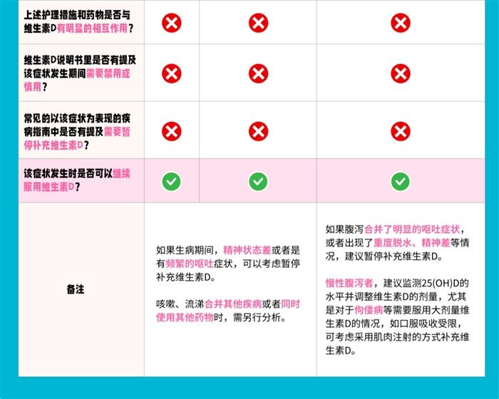 另外,如果生病期间,精神状态差或者是有频繁的呕吐症状,可以考虑暂停维生素 D;咳嗽、流涕合并其他疾病或者同时使用其他药物时,需另行分析。