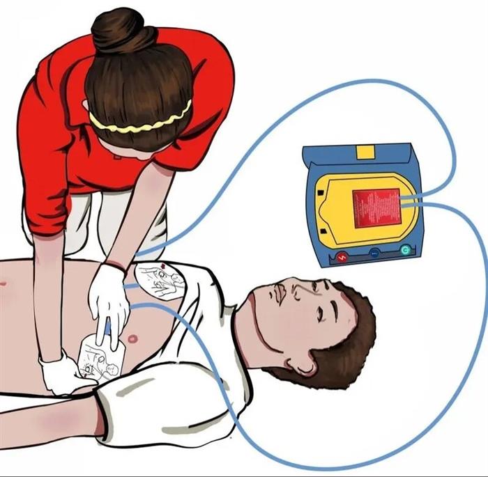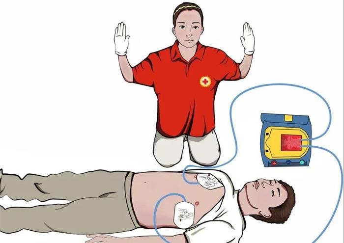 首先,需进行高质量的心肺复苏,胸外按压深度至少5厘米,速率为每分钟100~120次,30次按压后2次人工呼吸,交替进行。当医护人员到来前,除了心肺复苏,还应该使用AED(自动体外除颤器)。