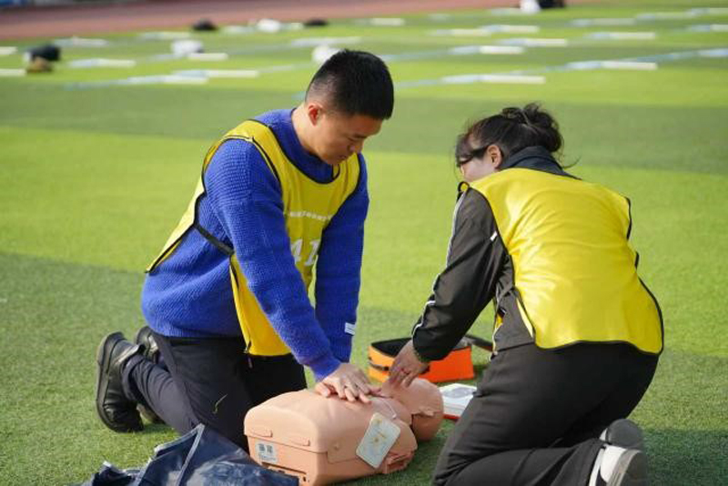“按压频率保持每分钟100—120次!”“准备除颤,无关人员远离!”四川护理职业学院体育场内,应急及紧急医疗技能比赛的紧张指令此起彼伏,参赛队员正争分夺秒开展模拟救援……
