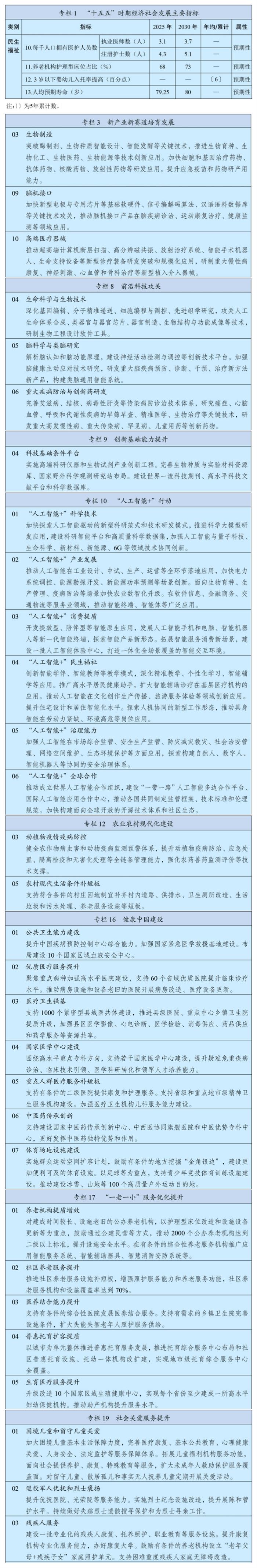 3月12日,十四届全国人大四次会议表决通过国民经济和社会发展第十五个五年规划纲要。纲要共分为18篇,对我国未来5年的经济社会发展作出全面部署。其中,对未来5年卫生健康领域的发展,纲要围绕人口高质量发展、健康中国建设、积极应对人口老龄化等核心任务明确行动方向,提出“人民群众养老托育服务需求得到更好满足,人均预期寿命提高到80岁,社会保障制度更加优化更可持续,基本公共服务均等化水平明显提升”的主要目标,明确“每千人口拥有执业医师数3.7人、注册护士数5.1人,养老机构护理型床位占比达到73%,3岁以下婴幼儿入托率提高6个百分点”等主要指标,奋力开创中国式现代化建设新局面。