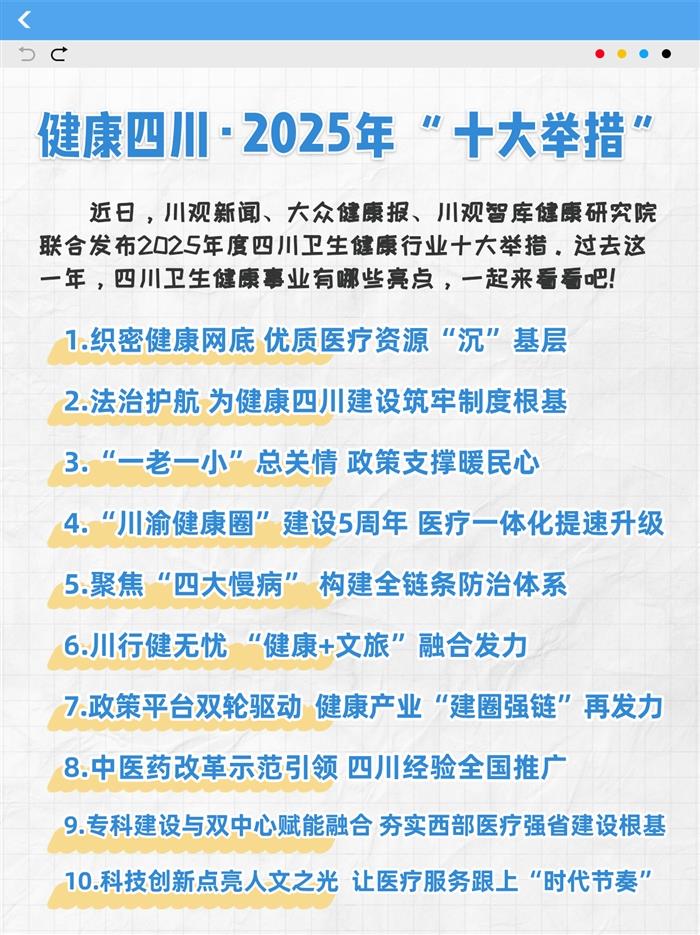 近日,川观新闻、大众健康报、川观智库健康研究院联合发布2025年度四川卫生健康行业十大举措。过去这一年,四川卫生健康事业有哪些亮点,一起来看看吧!